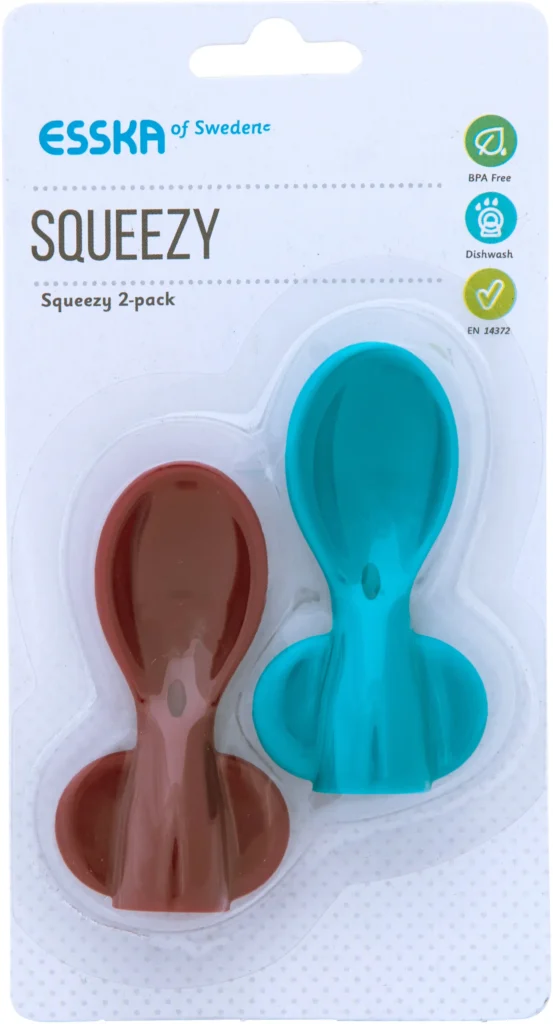 Med ESSKA Squeezy praktiska matningsked kan du nå all mat i barnmatsburken utan kladd. Skedens grunda form gör det också lättare för de små att äta.