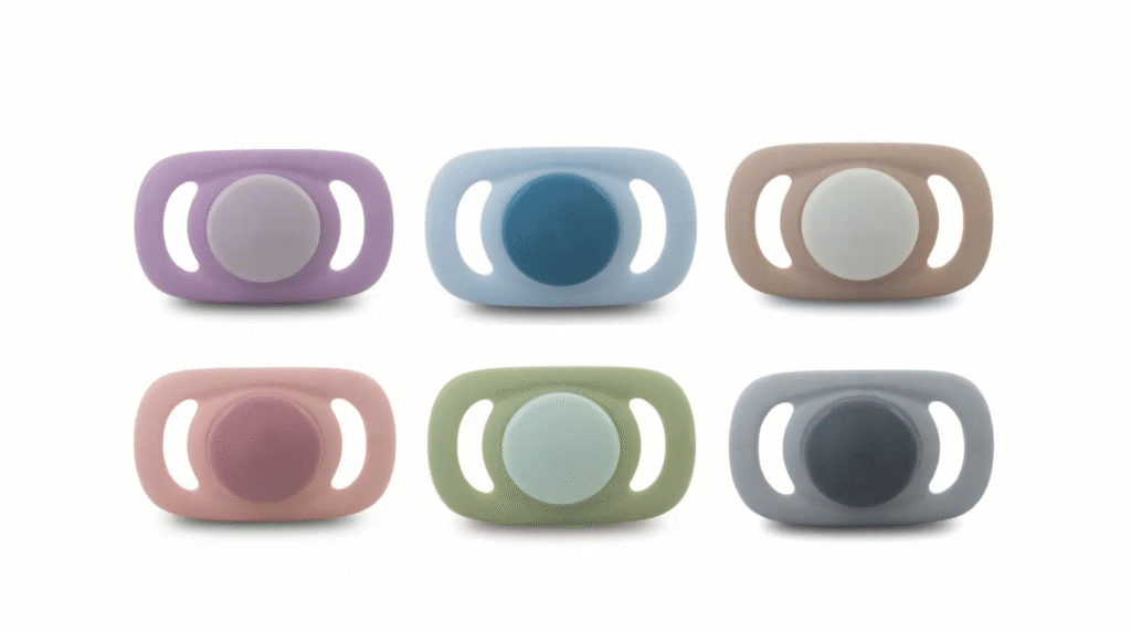 ESSKA Knoppa har en neutral och minimalistisk form, med ring och symmetrisk sugdel. Dessutom är den snäll mot barns känsliga hud då den välventilerade skölden förhindrar hudirritation kring munnen.