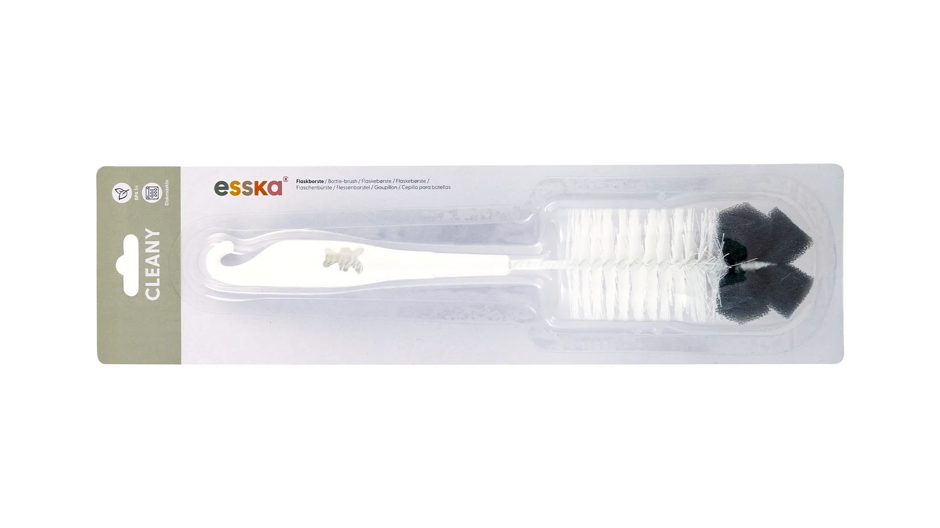 ESSKA Cleany flaskborste gör det enkelt att diska flaskor! Två borstar i en: Den stora borsten används t.ex. till flaskans insida. I handtagets andra ände finns en liten borste som är perfekt för att komma åt skrymslen och vrår på t.ex. dinappar. Så praktiskt! Kan maskindiskas.