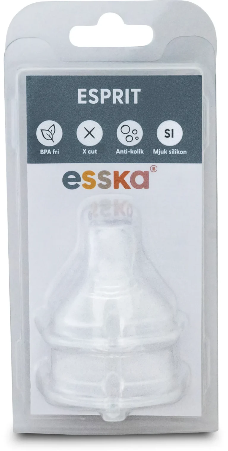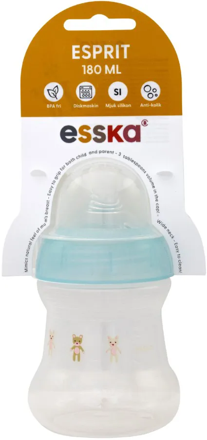 Esprit nappflaskas ergonomiska form gör den lätt att hålla i för både barn och vuxen. Flaska och lock har tydlig gradering som underlättar att mäta upp rätt mängd. Det läckagesäkra locket kan användas som måttskopa. Nappflaskan har en bred öppning och innehåller inte fler delar än en traditionell nappflaska, vilket gör den lätt att fylla och rengöra. Kan kokas, värmas i mikro och diskas i diskmaskin. Dinapp storlek M ingår.