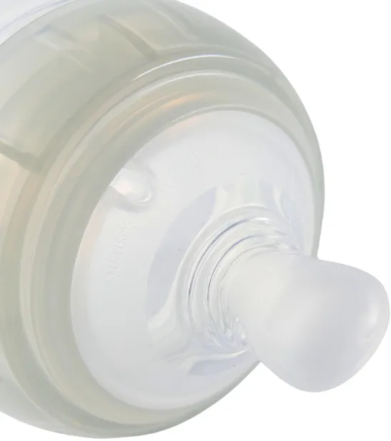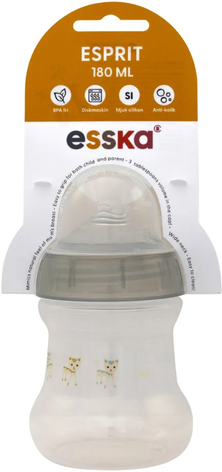 Esprit nappflaskas ergonomiska form gör den lätt att hålla i för både barn och vuxen. Flaska och lock har tydlig gradering som underlättar att mäta upp rätt mängd. Det läckagesäkra locket kan användas som måttskopa. Nappflaskan har en bred öppning och innehåller inte fler delar än en traditionell nappflaska, vilket gör den lätt att fylla och rengöra. Kan kokas, värmas i mikro och diskas i diskmaskin. Dinapp storlek M ingår.